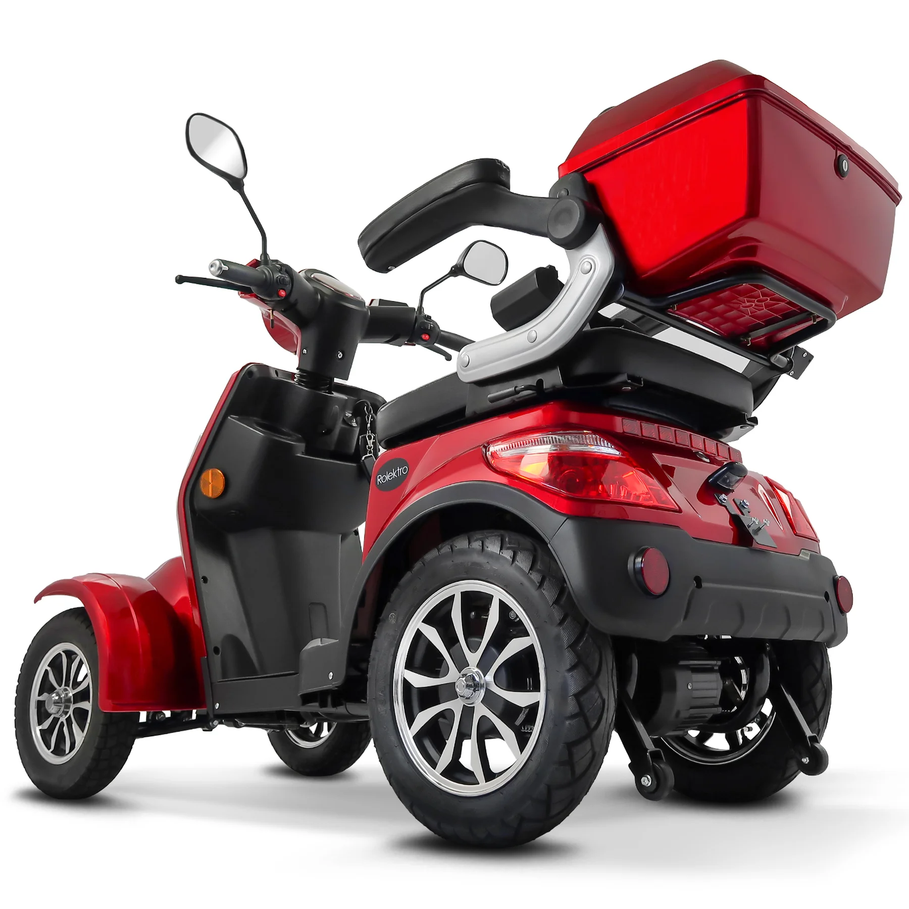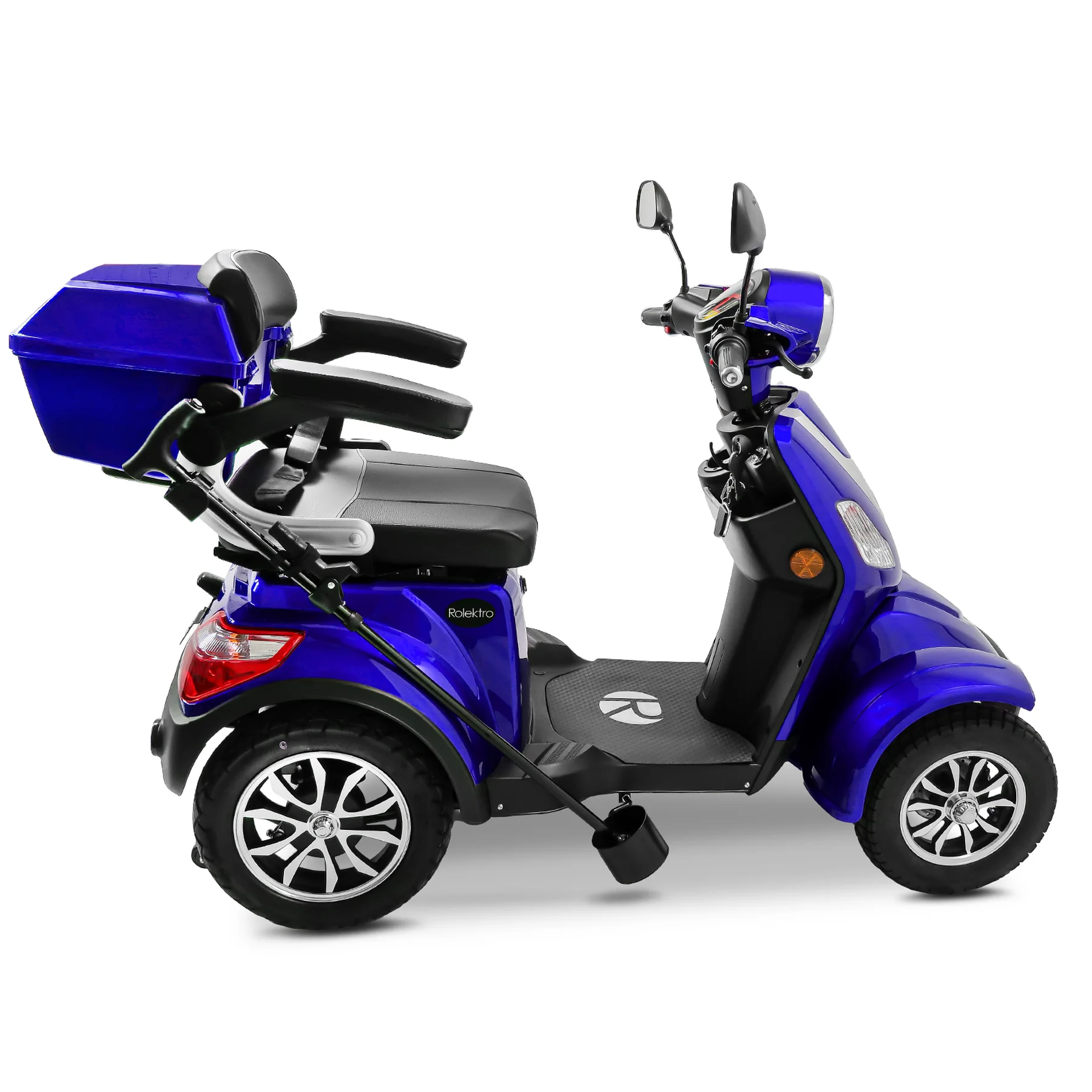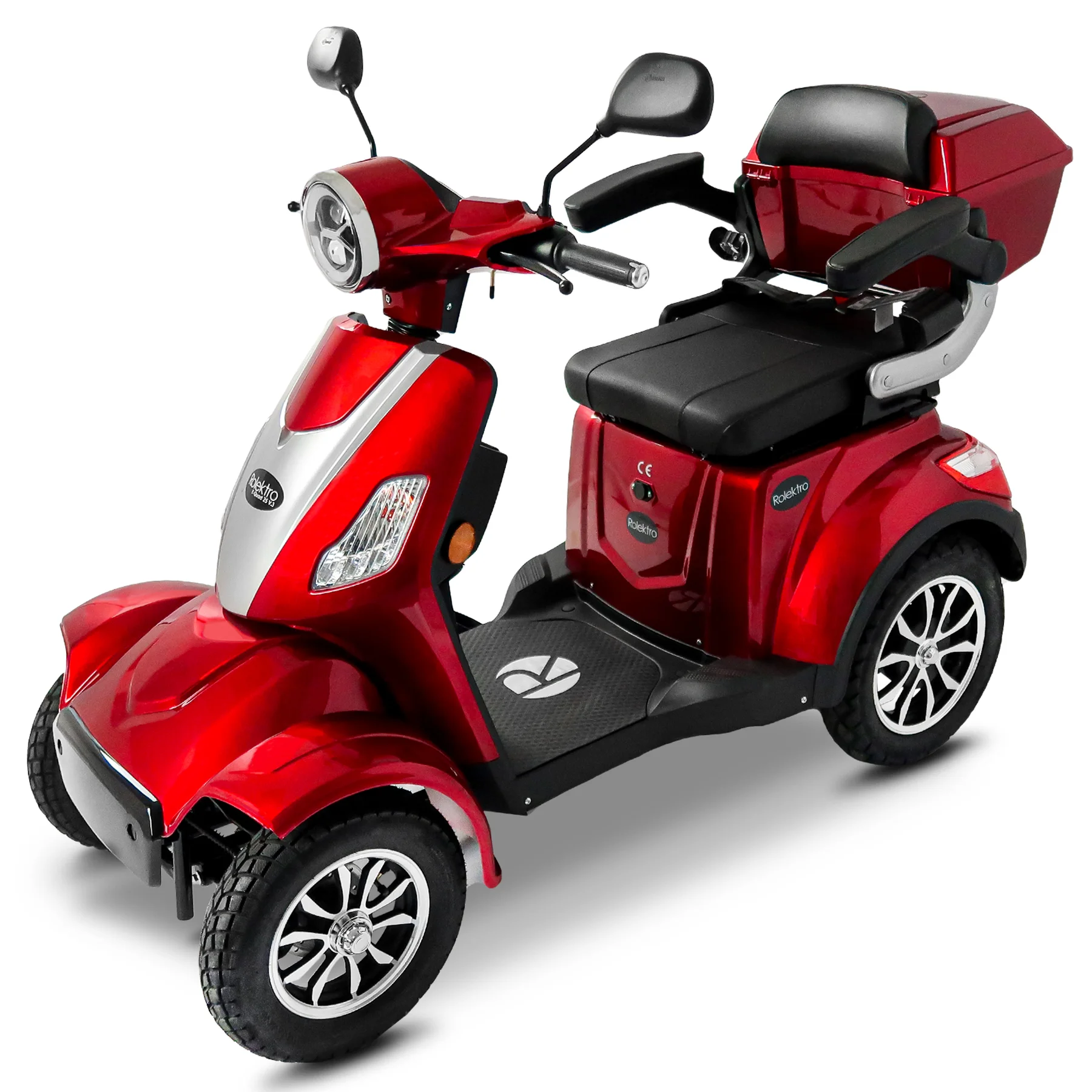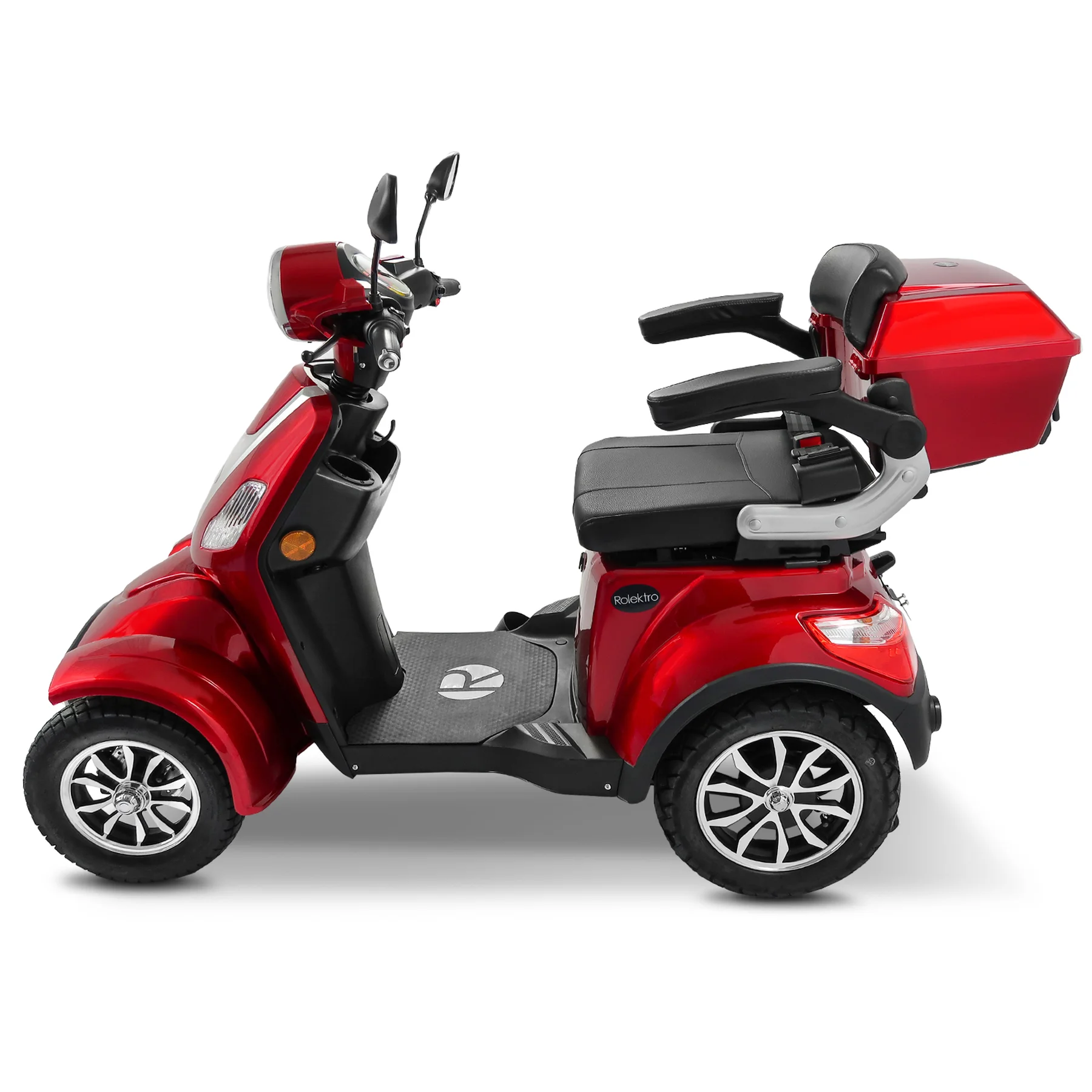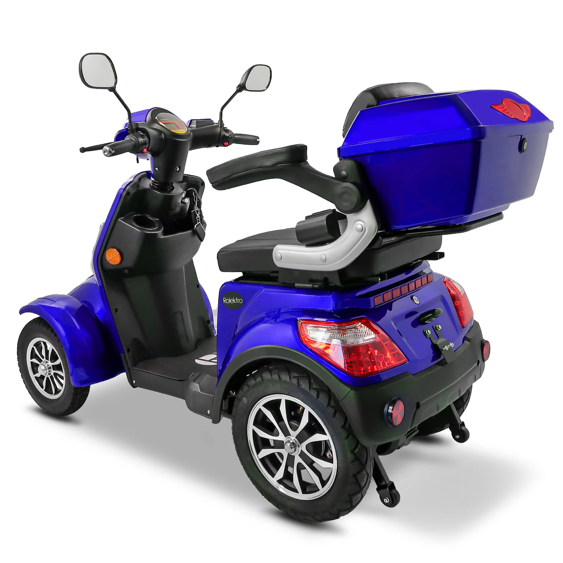 Das Rolektro E-Quad 25 V.3 Premium ist ein vierrädriges Elektromobil der neuesten Generation, das für Komfort, Sicherheit und Alltagstauglichkeit entwickelt wurde. Mit europäischer Straßenzulassung, robustem Stahlrohrrahmen und leistungsstarkem 1000 Watt Motor erreicht es eine Höchstgeschwindigkeit von bis zu 25 km/h und ist ideal für Senioren, Menschen mit eingeschränkter Mobilität sowie für den städtischen Einsatz. Ausgestattet mit einem herausnehmbaren 60V-30Ah Lithium Akku erreicht das E-Quad eine Reichweite von bis zu 80 Kilometern. Der ergonomische Kapitänssitz bietet eine hohe Rückenlehne, klappbare Armlehnen und eine Kopfstütze. Ein integrierter Sicherheitsgurt schützt zusätzlich. Für ein sicheres Fahrverhalten sorgen eine Einzelradaufhängung vorne, zwei Stoßdämpfer hinten, Scheibenbremse vorne, Trommelbremse hinten und eine Feststellbremse am Lenker. Die Steigfähigkeit von bis zu 12 Prozent ermöglicht auch das Befahren von leichten Steigungen. Eine Windschutzscheibe schützt vor Fahrtwind, Insekten und Schmutz. USB-Ladebuchsen und praktische Ablagefächer unter dem Sitz sowie ein abschließbares Topcase bieten zusätzlichen Komfort und Stauraum. Das digitale Farbdisplay informiert zuverlässig über Geschwindigkeit, Akkustand, Gesamtkilometer und weitere Fahrzeugdaten. Das Batteriemanagementsystem (BMS) liefert präzise Ladeinformationen. Eine Alarmanlage mit Fernbedienung sorgt für zusätzlichen Diebstahlschutz. Das E-Quad ist in den Farben Rot, Blau und Schwarz erhältlich. Das Fahrzeug kann über unser Portal e-move24 per Click & Collect bestellt werden. Dabei wird das Fahrzeug beim Fachhandelpartner fertig aufgebaut abgeholt, der auch den After-Sales-Service übernimmt. Nicht alle Click & Collect-Partner haben Probefahrzeuge vor Ort – wer eine Probefahrt machen möchte, sollte gezielt nach Verkaufspunkten mit Probefahrtmöglichkeit suchen und vorab telefonisch die Verfügbarkeit prüfen.