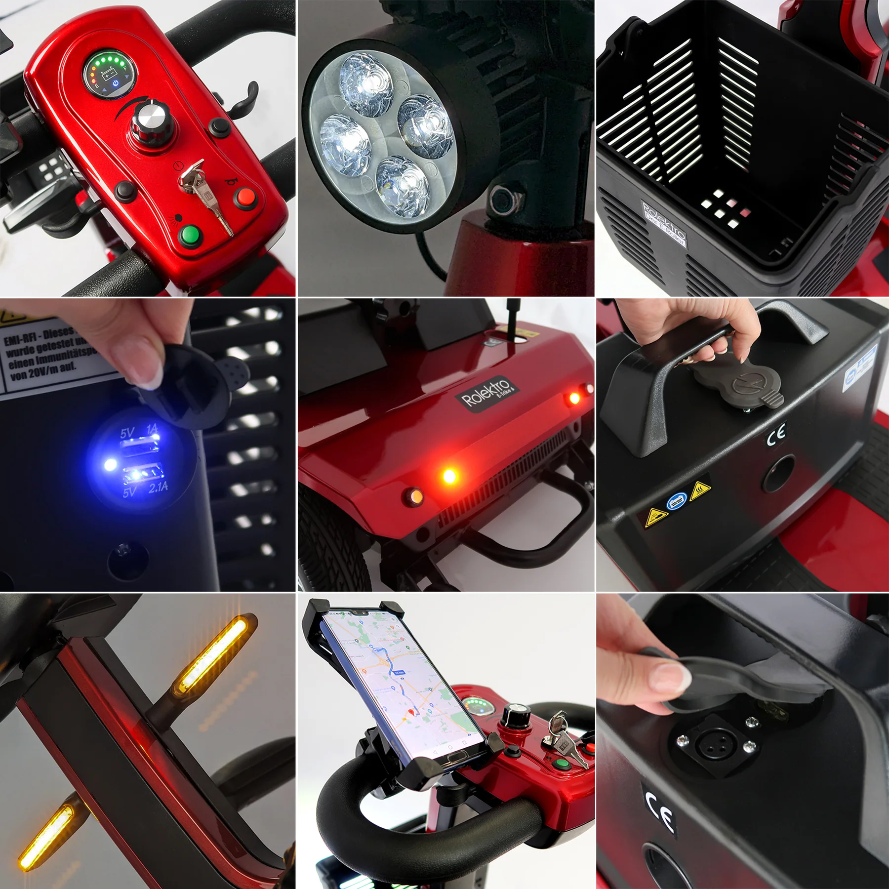 Das Rolektro E-Trike 6 V.3 ist ein modernes Elektromobil auf drei Rädern, das Komfort, Sicherheit und Mobilität für Senioren und Menschen mit eingeschränkter Mobilität vereint. Ob für den Nahbereich, in Wohnhäusern oder auf Bürgersteigen, das Trike ermöglicht selbstständige Fortbewegung in allen Lebensbereichen. Mit nur 50 cm Breite und 110 cm Länge passiert es mühelos Türen und Aufzüge. Es hat eine Reichweite von bis zu 20 Kilometern und eine Höchstgeschwindigkeit von 6 kmh. Der 300 Watt Motor sorgt für eine Steigfähigkeit von bis zu 16 Prozent. Alle Modelle sind in Rot erhältlich und bieten einen komfortablen 360 Grad drehbaren Sitz, hochklappbare Armlehnen sowie einen abnehmbaren Frontkorb für Stauraum. Das Trike ist faltbar, leicht zerlegbar und daher ideal für Transport, Urlaub oder Familienbesuche. Die Sicherheitsausstattung umfasst Anti-Kipp-Räder hinten, LED-Frontlicht, Rücklicht, Blinker, Warnblinkanlage und Vollgummi-Reifen. Die automatische Magnetbremse gewährleistet zusätzliche Sicherheit. Zwei USB-Buchsen und eine Handyhalterung sind standardmäßig integriert. Durch seinen kleinen Wendekreis ist das Trike auch in engen Räumen leicht zu manövrieren. Die maximale Zuladung beträgt 130 Kilogramm. Das E-Trike 6 V.3 kann über e-move24 per Click & Collect bestellt werden. Das Fahrzeug wird fertig aufgebaut beim Fachhandelpartner abgeholt, der auch den After-Sales-Service übernimmt. Probefahrten sind nur bei ausgewählten Partnern möglich. Nicht jeder Click & Collect-Partner hält Probefahrzeuge bereit, daher empfiehlt es sich, vorab telefonisch die Verfügbarkeit zu prüfen.