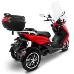 Der MAXIMUS MX3-25 ist ein innovativer 3-Rad E-Roller, der speziell für zwei Personen entwickelt wurde. Die bequeme Sitzbank und optimal platzierte Fußrasten sorgen für eine komfortable Sitzposition, während die extra große Windschutzscheibe Fahrer und Beifahrer vor Fahrtwind, Insekten und anderen Objekten schützt. Das moderne Design in rot-schwarz mit LED-Scheinwerfern und sportlicher Optik macht den Roller zu einem echten Hingucker auf der Straße. Ausgestattet mit einem 1500 Watt starken Elektromotor und einer 60 Volt Lithium-Batterie erreicht der MAXIMUS MX3-25 bis zu 25 km/h. Drei wählbare Geschwindigkeitsstufen bieten Flexibilität bei unterschiedlichen Verkehrssituationen. Der entnehmbare Akku kann bequem zu Hause an jeder haushaltsüblichen Steckdose geladen werden. Mit einer Akkuladung sind bis zu 70 km möglich. Optional kann ein zweiter Akku unter der Sitzbank eingesetzt werden, um die Reichweite auf bis zu 140 km zu erhöhen und maximale Freiheit zu genießen. Die Federung vorne und hinten sorgt für eine ruhige Fahrt auch auf unebenen Straßen. Scheibenbremse vorne und zwei Trommelbremsen hinten garantieren eine sichere und gleichmäßige Bremsleistung. LED-Scheinwerfer und Rückleuchten sorgen für optimale Sichtbarkeit bei Dunkelheit oder schlechtem Wetter. Das digitale Cockpit zeigt alle relevanten Informationen wie Geschwindigkeit, Akkustand und Gesamtkilometer an. Zusätzliche Extras wie USB-Ladebuchse, Handyhalterung, Alarmanlage und Topcase machen den Roller besonders praktisch für den Alltag. Der MAXIMUS MX3-25 verfügt über eine EU-Straßenzulassung und darf mit zwei Personen gefahren werden. Bei angelegten Gurten entfällt die Helmpflicht. Der Roller eignet sich ideal für umweltfreundliche Mobilität, Freizeitfahrten und kurze Strecken in der Stadt. Sie können den MAXIMUS MX3-25 bequem über das Portal e-move24 per Click & Collect bestellen. Ihr Fahrzeug wird dabei beim Fachhandelspartner fertig aufgebaut und kann direkt abgeholt werden. Die Partner übernehmen auch den After-Sales-Service. Bitte beachten Sie, dass nicht alle Click & Collect-Partner Probefahrzeuge vor Ort haben. Wer eine Probefahrt machen möchte, sollte vorab telefonisch prüfen, ob das gewünschte Modell verfügbar ist.